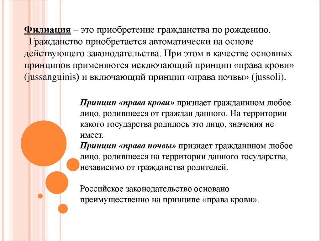 Филиация – это приобретение гражданства по рождению.Гражданство приобретается автоматически на основе