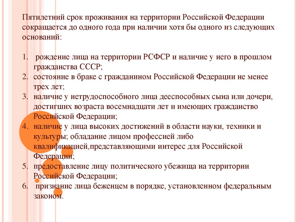 Пятилетний срок проживания на территории Российской Федерациисокращается до одного года при наличии хотя бы одного из следующих