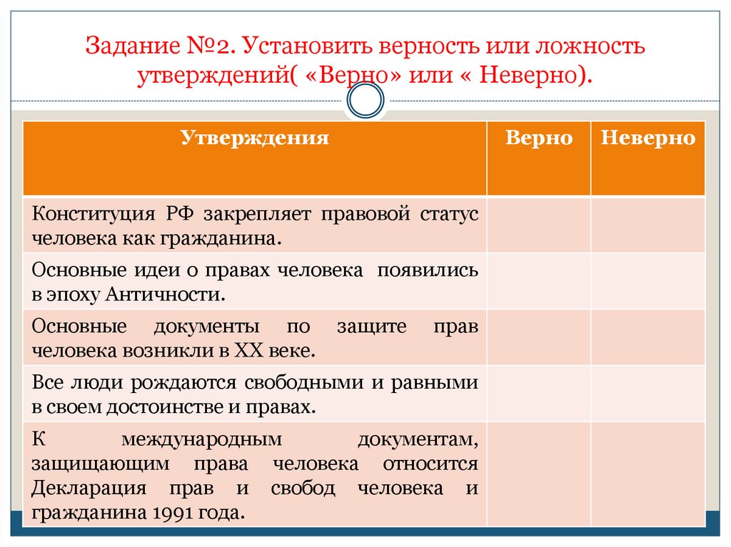 Задание №2. Установить верность или ложностьутверждений( «Верно» или « Неверно).