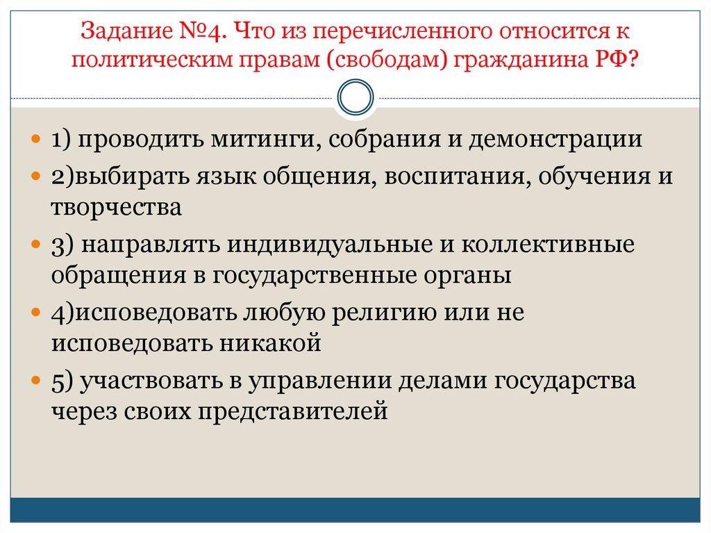 Задание №4. Что из перечисленного относится кполитическим правам (свободам) гражданина РФ?