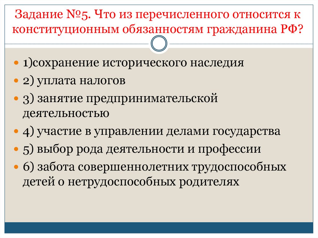 Задание №5. Что из перечисленного относится кконституционным обязанностям гражданина РФ?