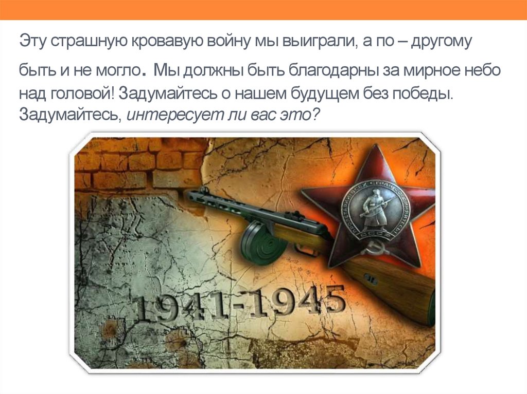 Эту страшную кровавую войну мы выиграли, а по – другомубыть и не могло. Мы должны быть благодарны за мирное небо