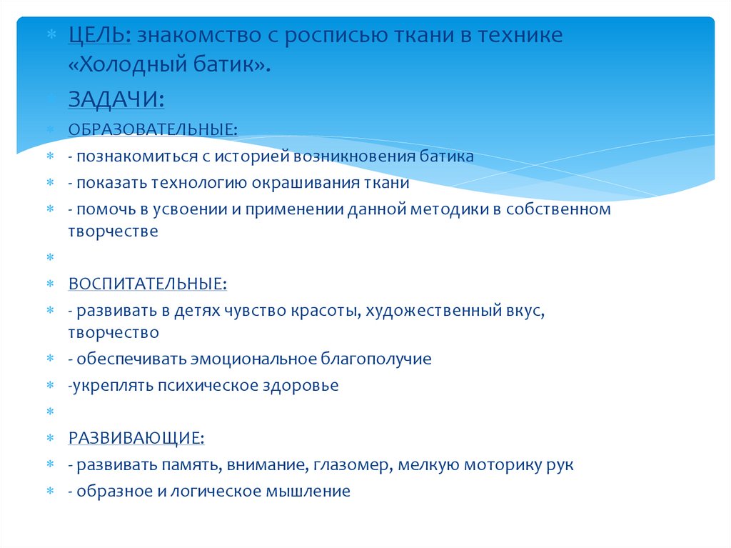 ЦЕЛЬ: знакомство с росписью ткани в технике«Холодный батик».