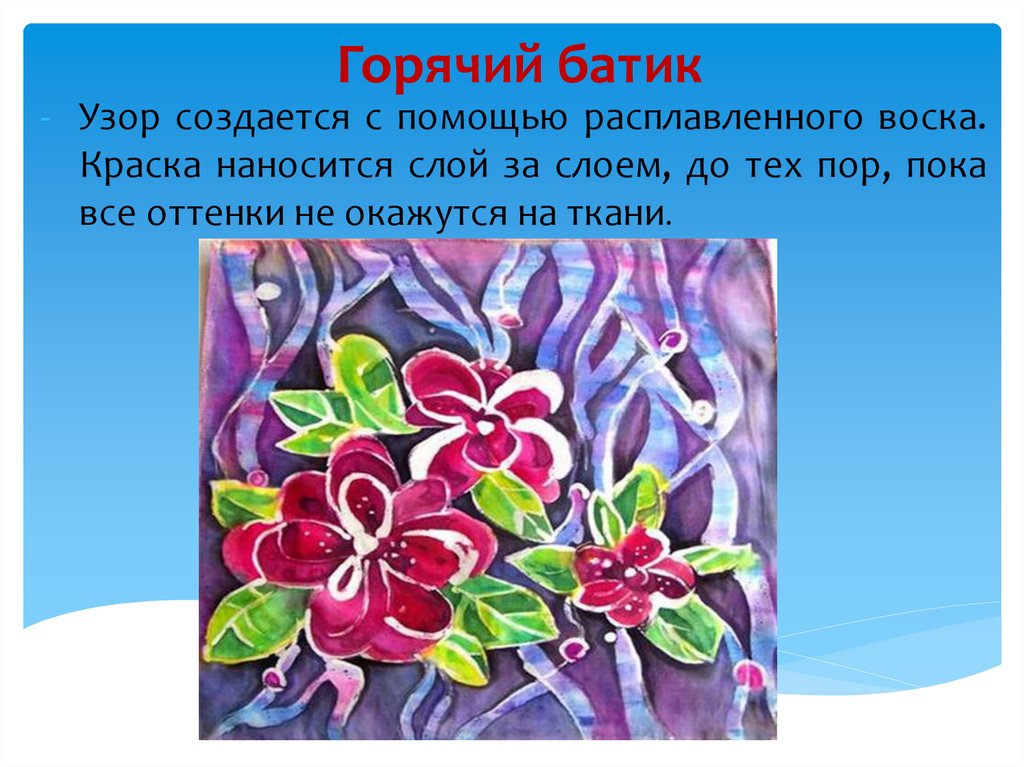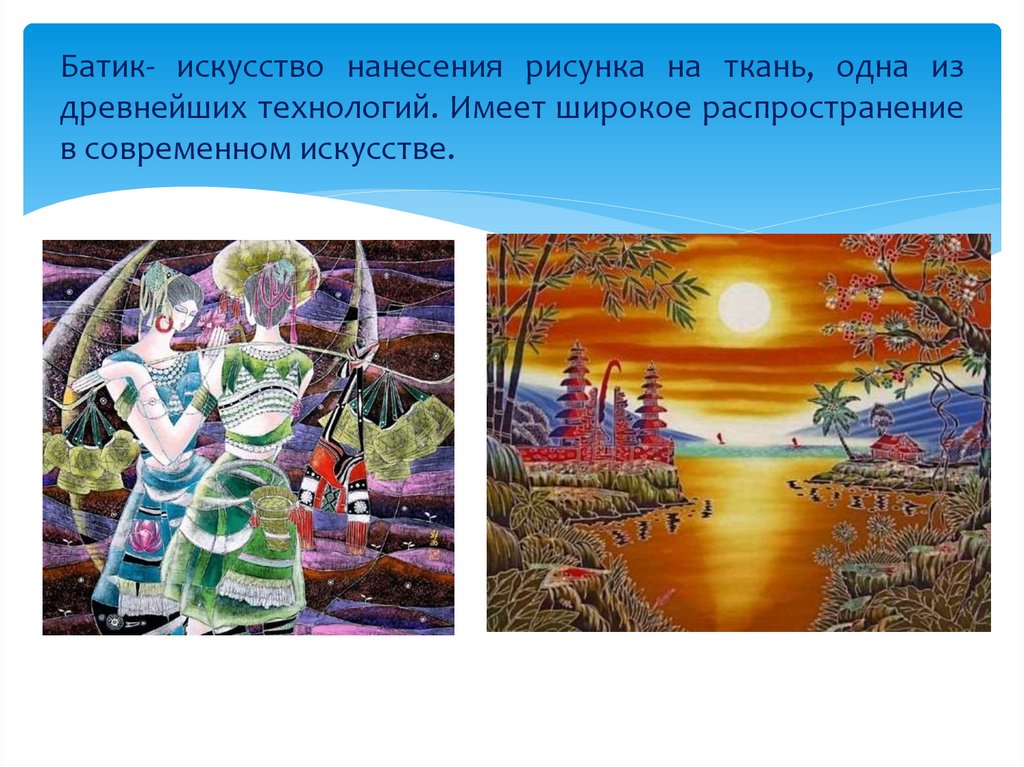 Батик- искусство нанесения рисунка на ткань, одна издревнейших технологий. Имеет широкое распространение