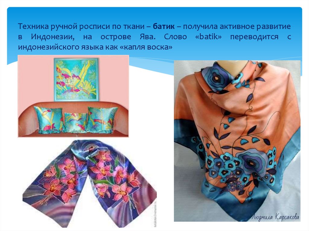 Техника ручной росписи по ткани – батик – получила активное развитиев Индонезии, на острове Ява. Слово «batik» переводится с
