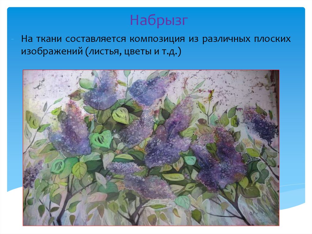 Набрызг- На ткани составляется композиция из различных плоских