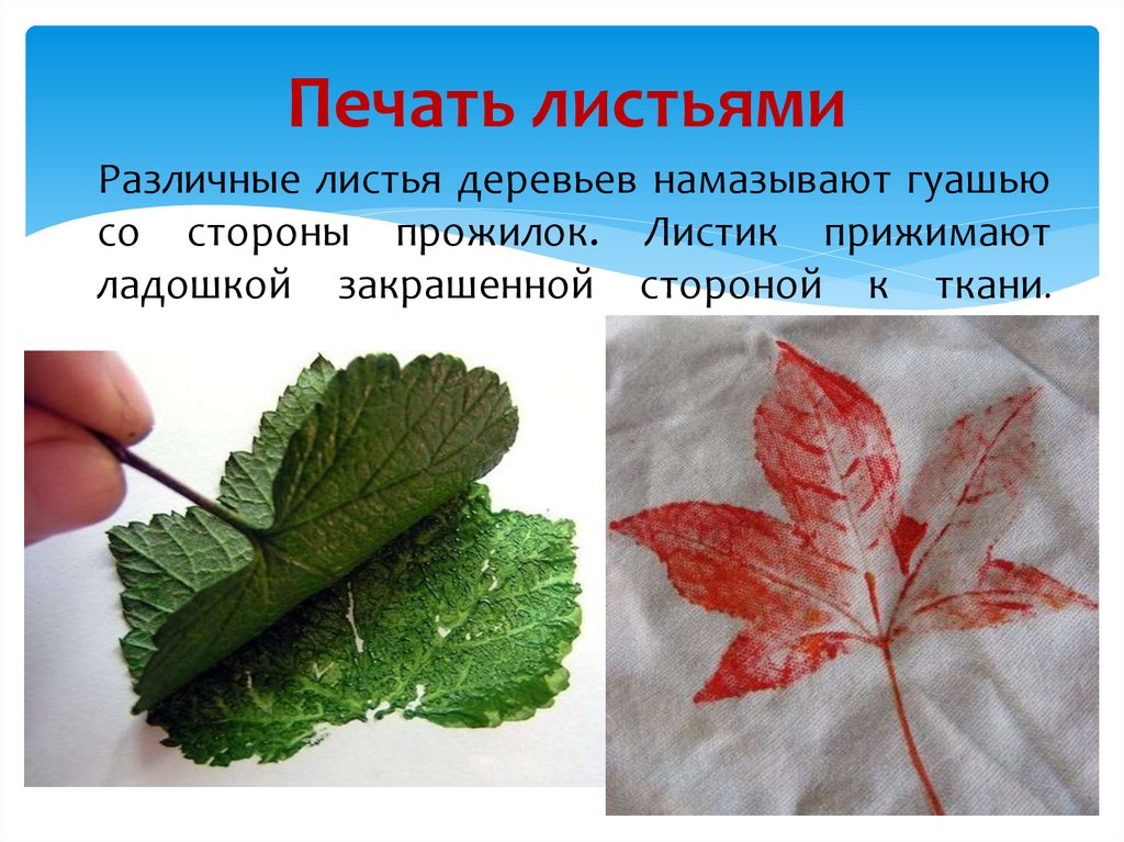 Печать листьямиРазличные листья деревьев намазывают гуашью