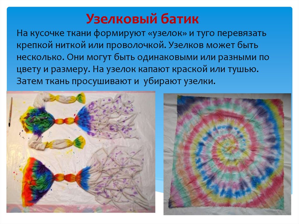Узелковый батикНа кусочке ткани формируют «узелок» и туго перевязать