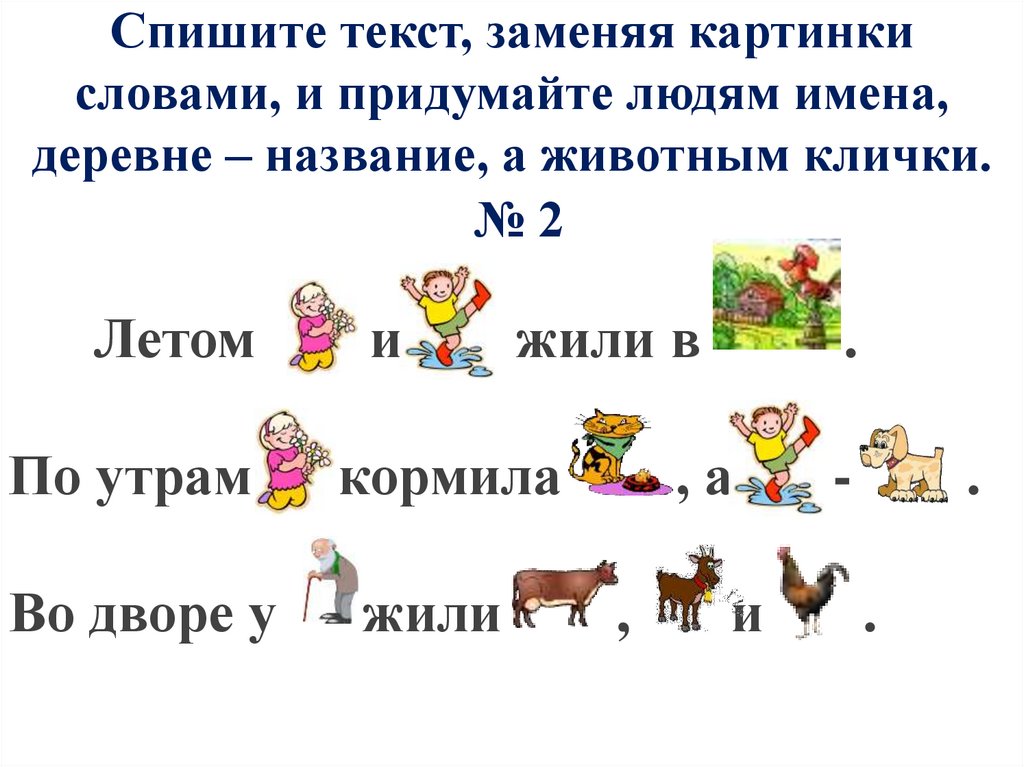 Спишите текст, заменяя картинкисловами, и придумайте людям имена,