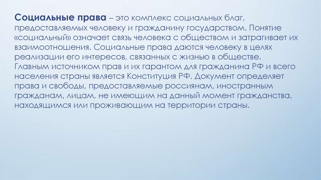Социальные права – это комплекс социальных благ,предоставляемых человеку и гражданину государством. Понятие