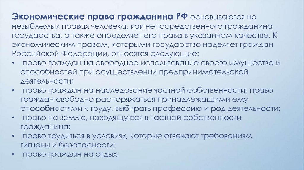 Экономические права гражданина РФ основываются нанезыблемых правах человека, как непосредственного гражданина