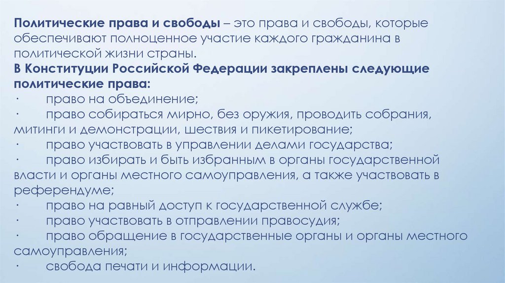 Политические права и свободы – это права и свободы, которыеобеспечивают полноценное участие каждого гражданина в