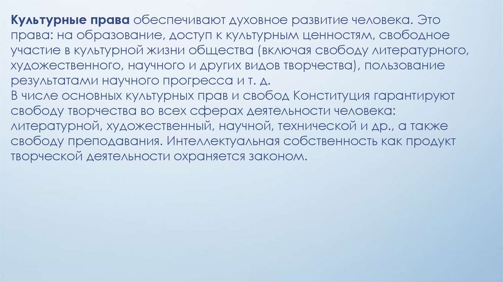 Культурные права обеспечивают духовное развитие человека. Этоправа: на образование, доступ к культурным ценностям, свободное