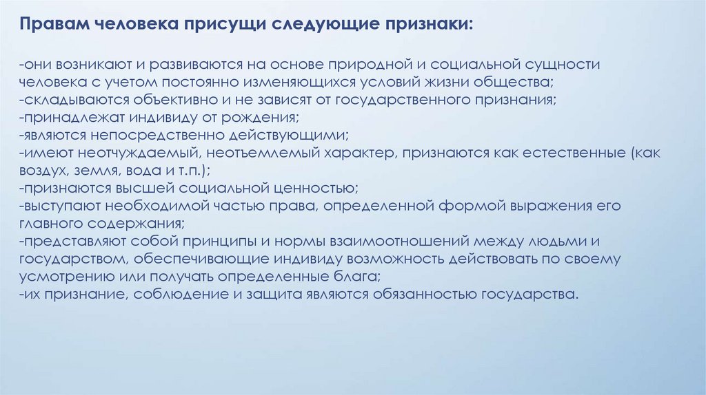 Правам человека присущи следующие признаки:-они возникают и развиваются на основе природной и социальной сущности