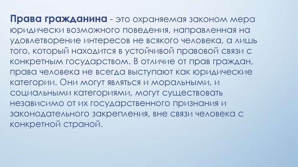 Права гражданина - это охраняемая законом мераюридически возможного поведения, направленная на