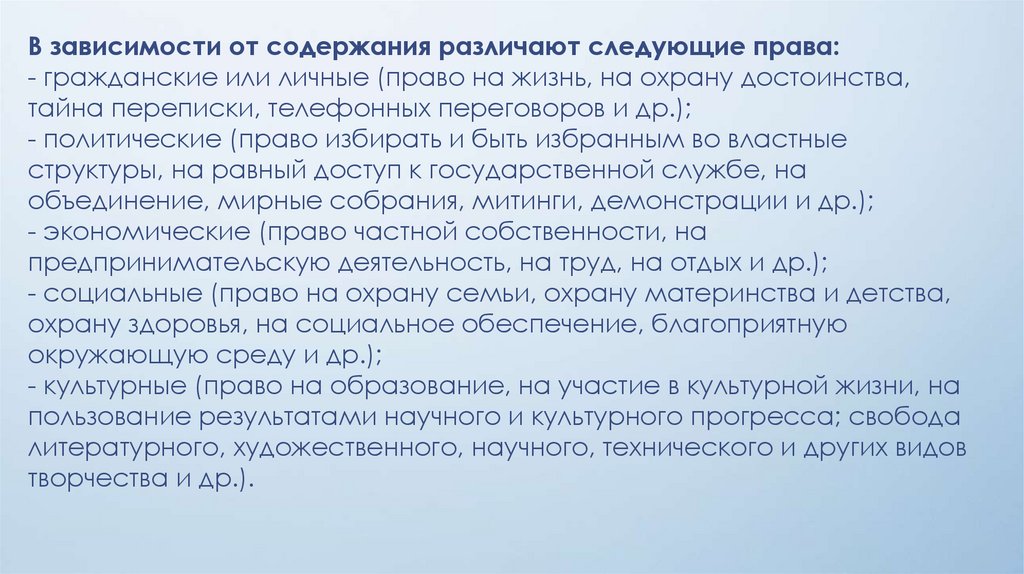 В зависимости от содержания различают следующие права:- гражданские или личные (право на жизнь, на охрану достоинства,