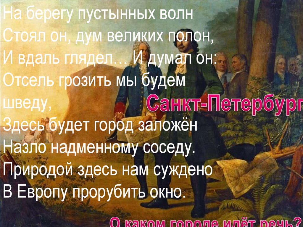 На берегу пустынных волнСтоял он, дум великих полон,