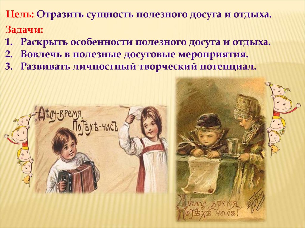 Цель: Отразить сущность полезного досуга и отдыха.Задачи: