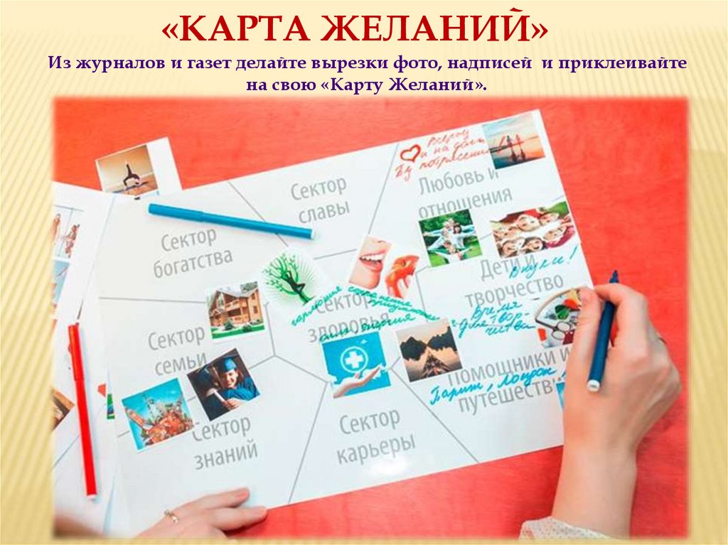 «КАРТА ЖЕЛАНИЙ»Из журналов и газет делайте вырезки фото, надписей и приклеивайте