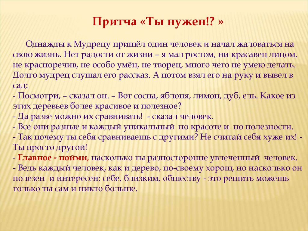 Притча «Ты нужен!? »Однажды к Мудрецу пришёл один человек и начал жаловаться на