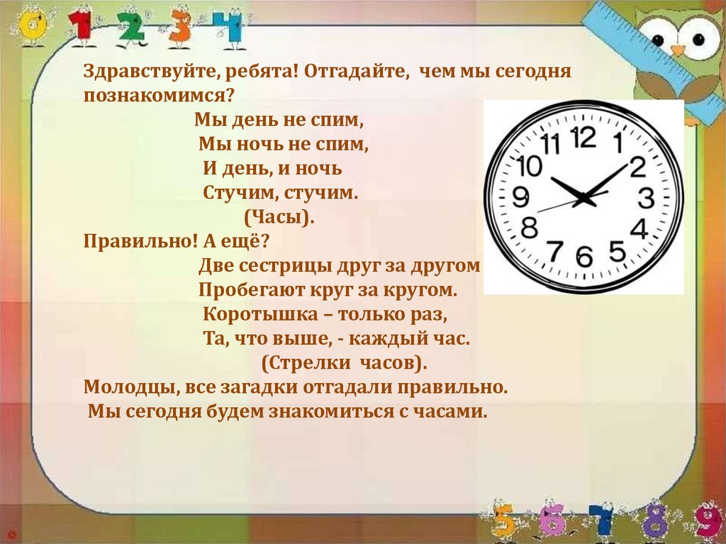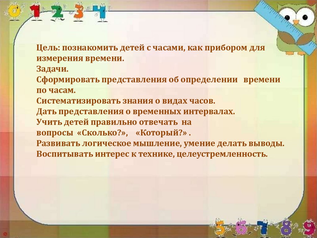 Цель: познакомить детей с часами, как прибором дляизмерения времени.