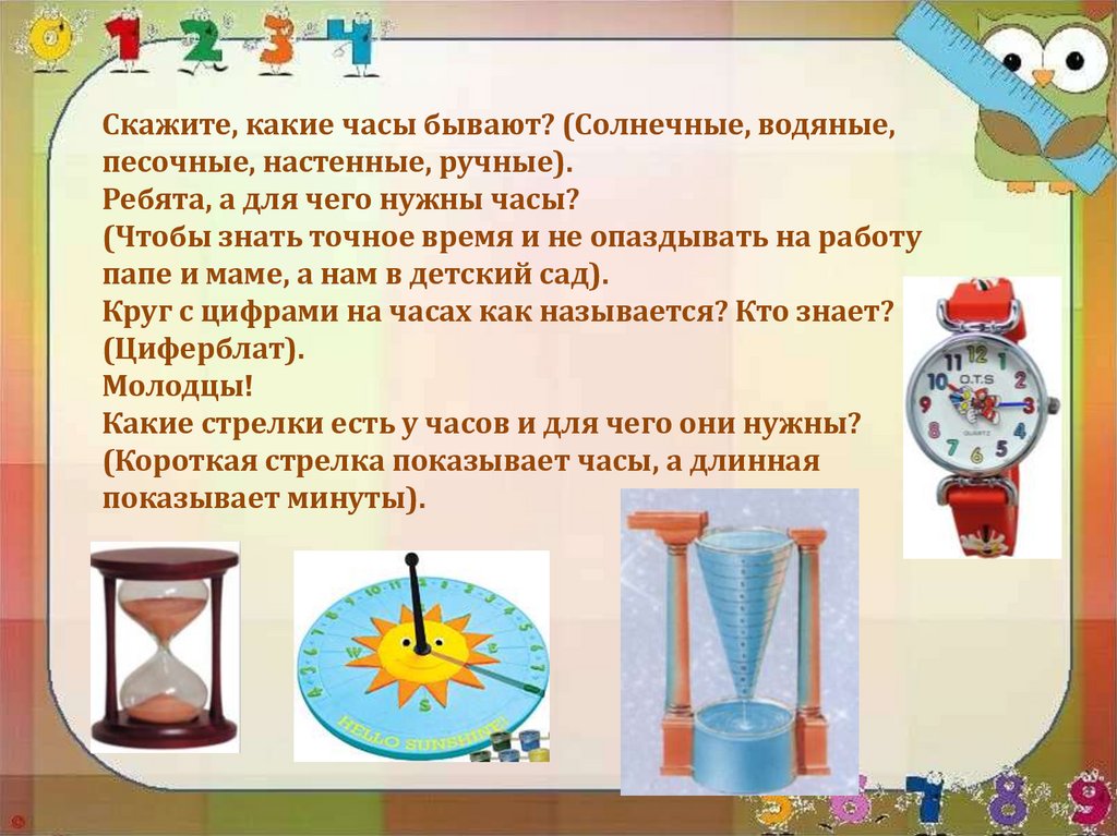 Скажите, какие часы бывают? (Солнечные, водяные,песочные, настенные, ручные).