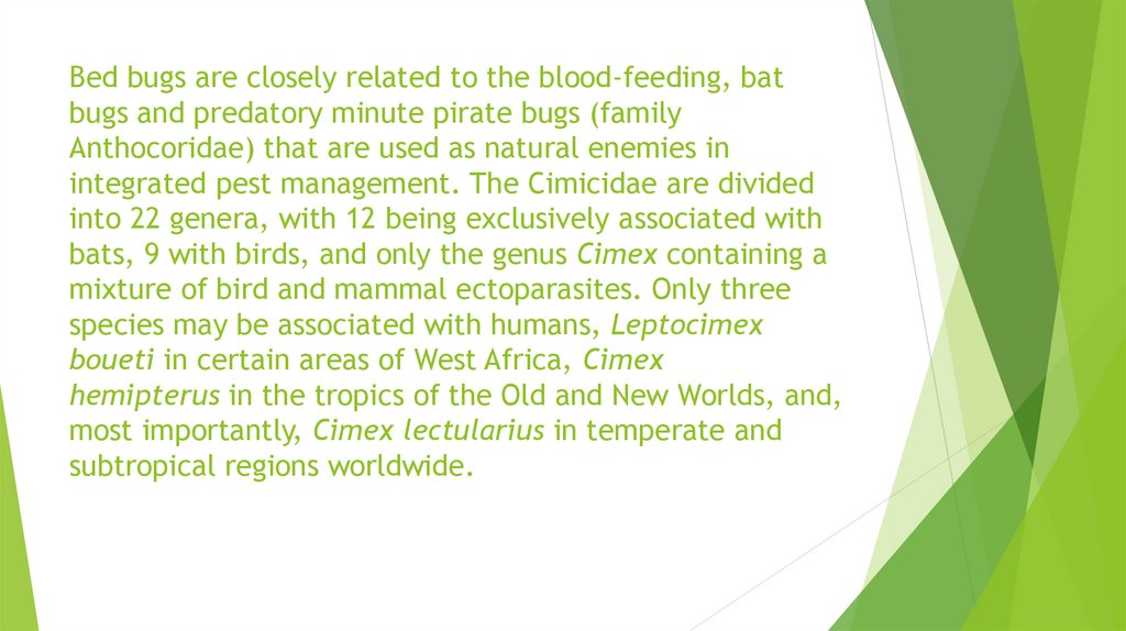 Bed bugs are closely related to the blood-feeding, batbugs and predatory minute pirate bugs (family
