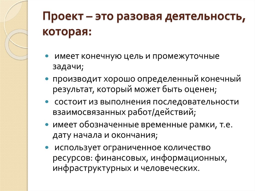 Проект – это разовая деятельность,которая: