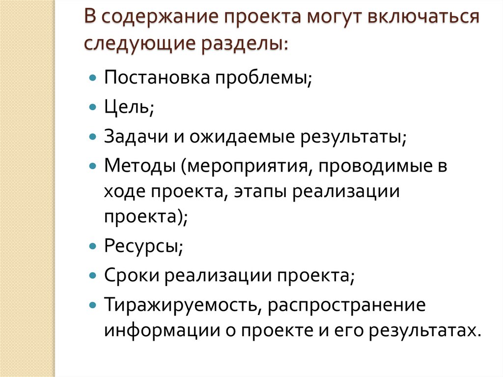 В содержание проекта могут включатьсяследующие разделы: