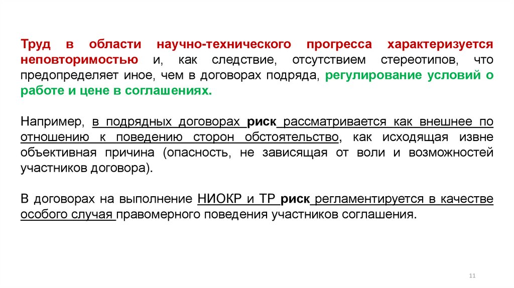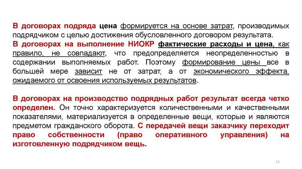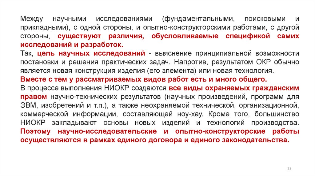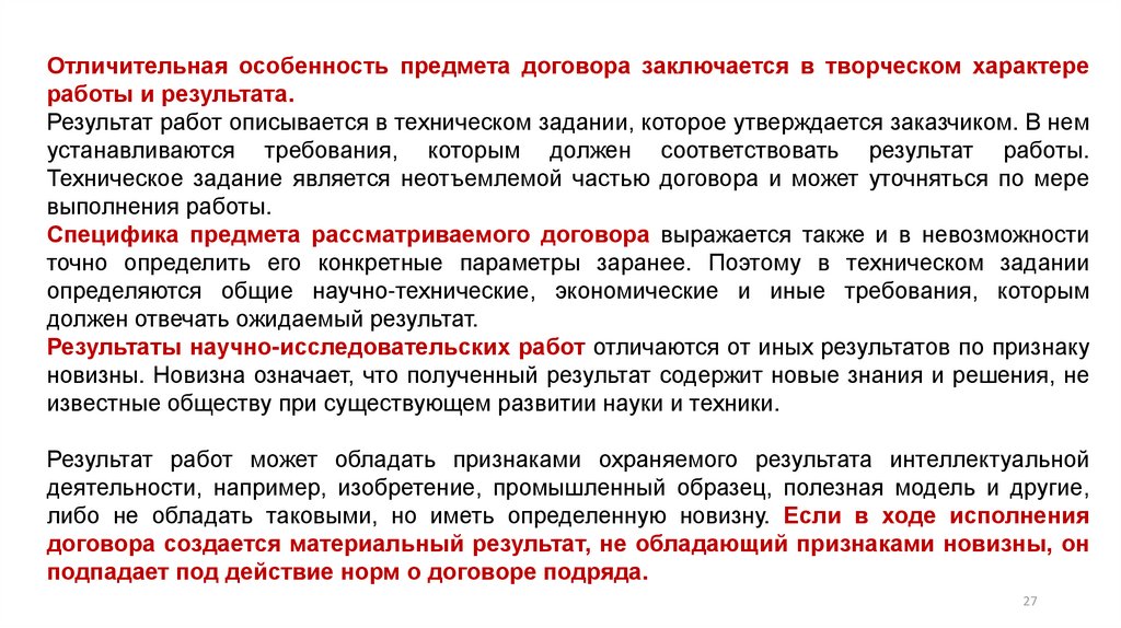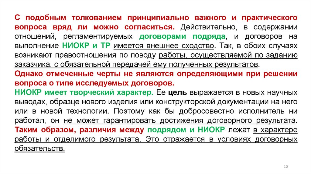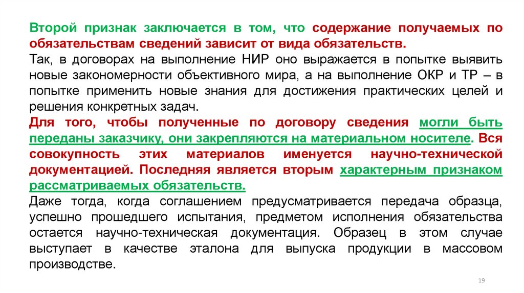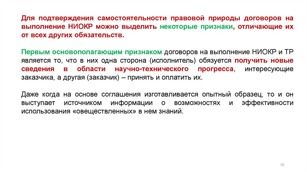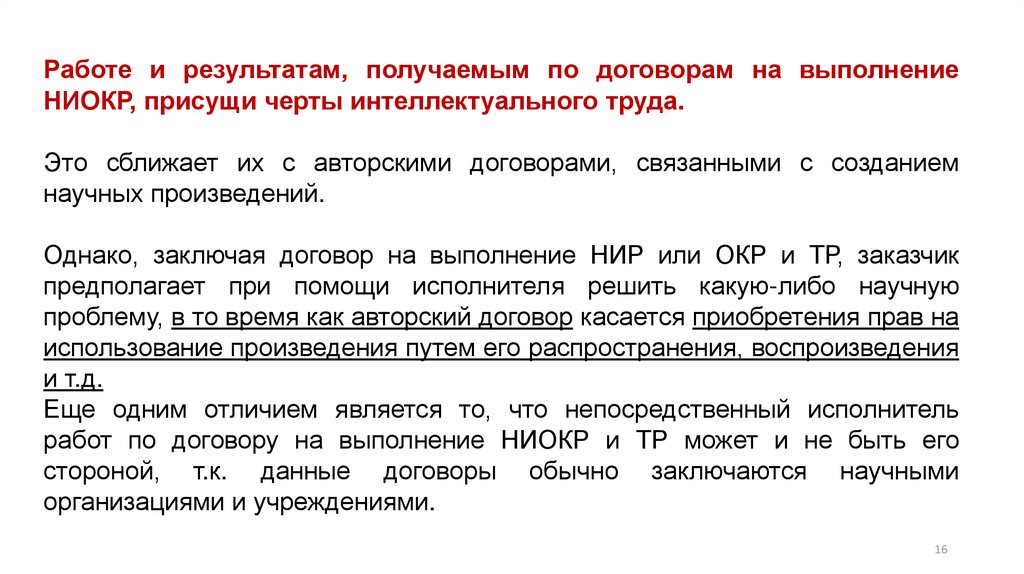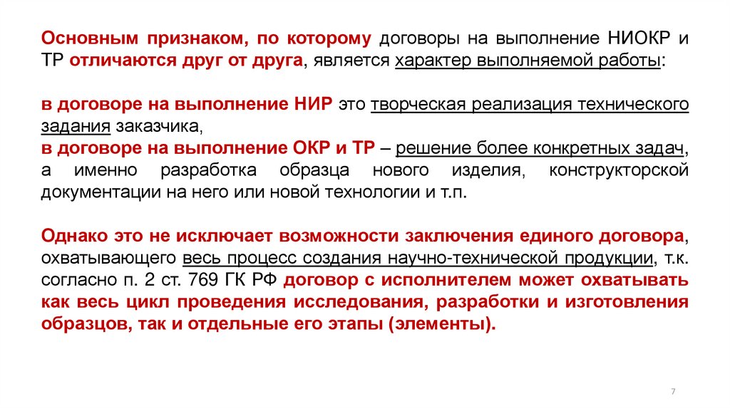 Основным признаком, по которому договоры на выполнение НИОКР иТР отличаются друг от друга, является характер выполняемой работы: