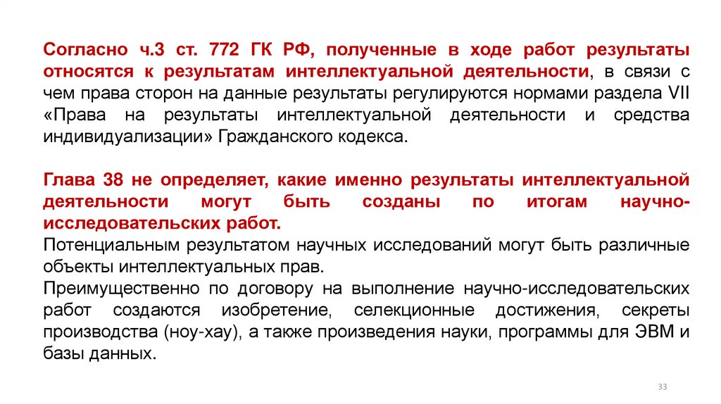 Согласно ч.3 ст. 772 ГК РФ, полученные в ходе работ результатыотносятся к результатам интеллектуальной деятельности, в связи с