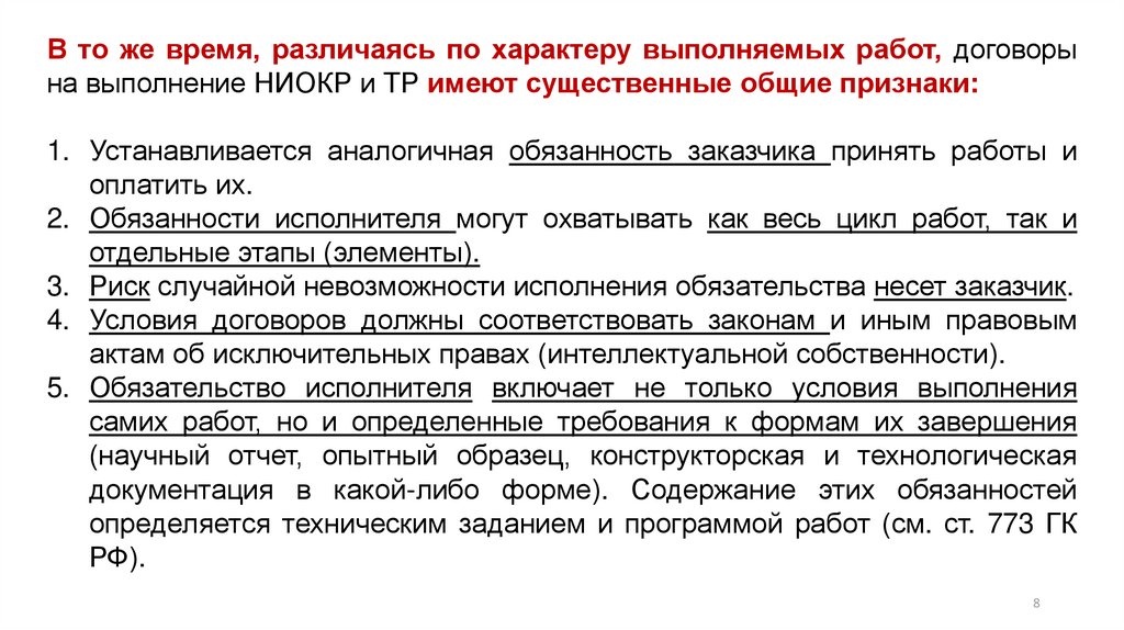 В то же время, различаясь по характеру выполняемых работ, договорына выполнение НИОКР и ТР имеют существенные общие признаки: