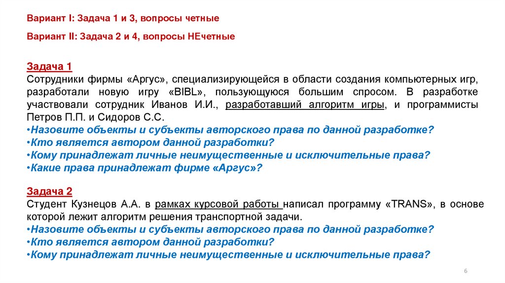 Вариант I: Задача 1 и 3, вопросы четныеВариант II: Задача 2 и 4, вопросы НЕчетные