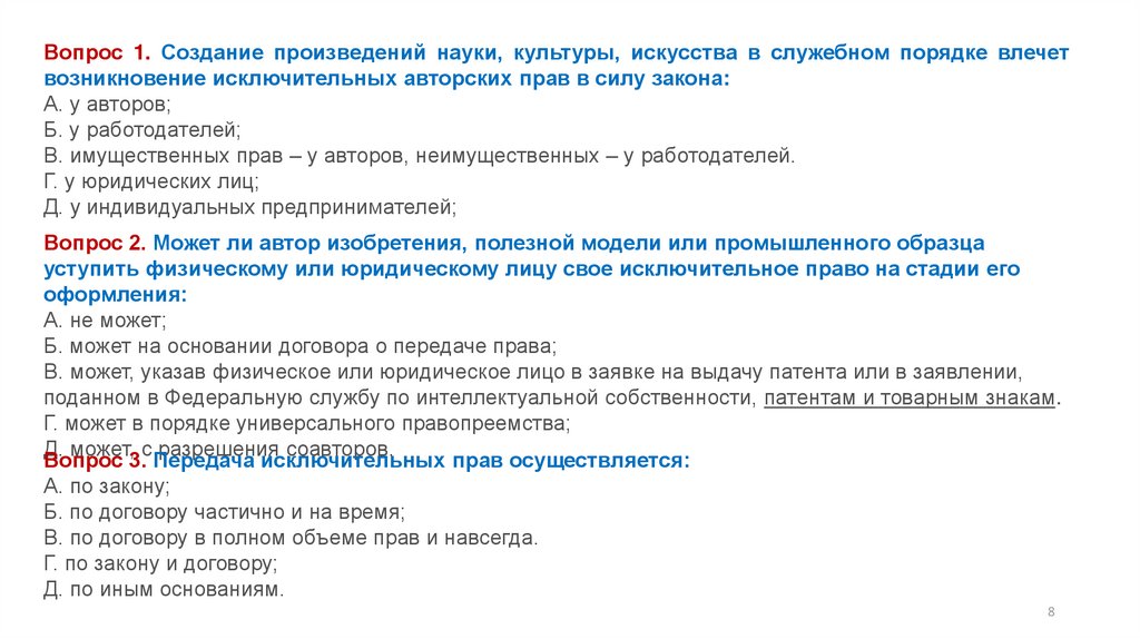 Вопрос 3. Передача исключительных прав осуществляется: