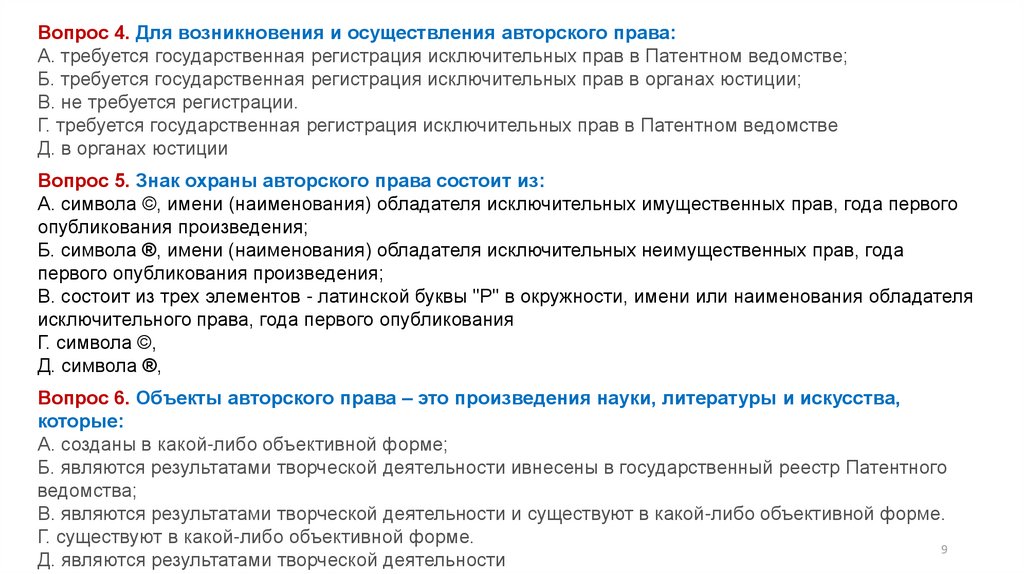 Вопрос 4. Для возникновения и осуществления авторского права:А. требуется государственная регистрация исключительных прав в Патентном ведомстве;