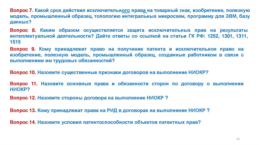 Вопрос 7. Какой срок действия исключительного права на товарный знак, изобретение, полезнуюмодель, промышленный образец, топологию интегральных микросхем, программу для ЭВМ, базу