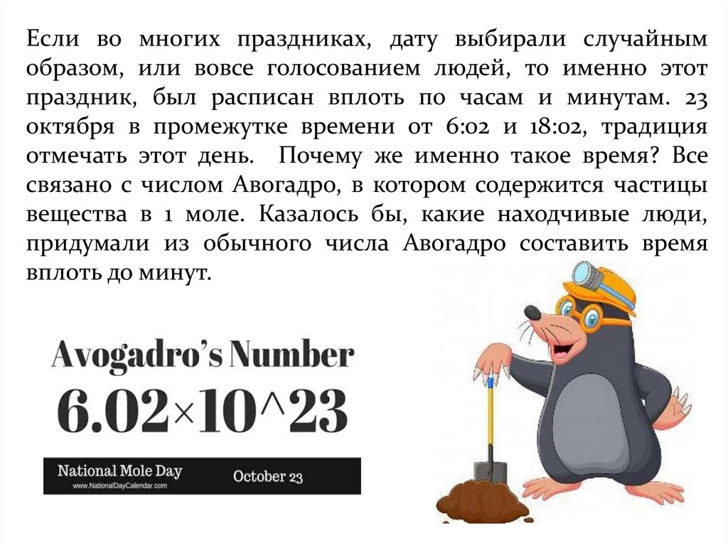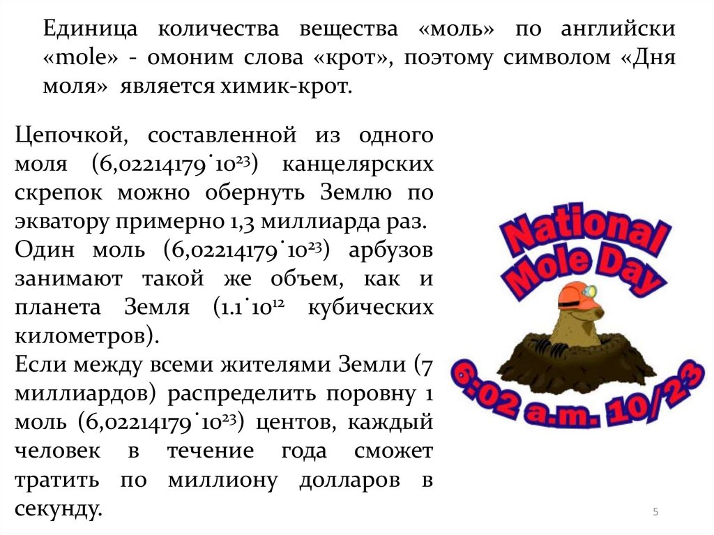 Единица количества вещества «моль» по английски«mole» - омоним слова «крот», поэтому символом «Дня
