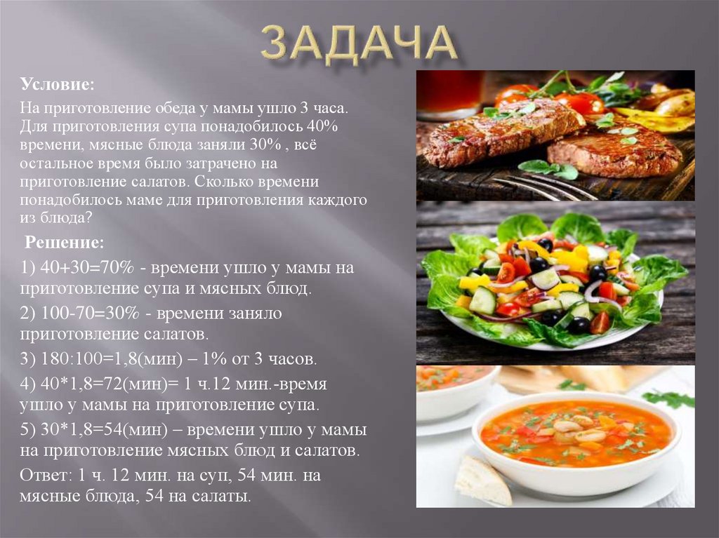 Условие:На приготовление обеда у мамы ушло 3 часа.
