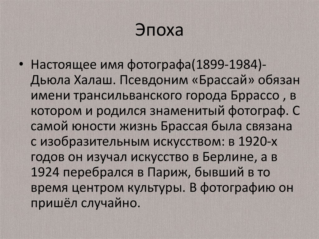 Эпоха• Настоящее имя фотографа(1899-1984)Дьюла Халаш. Псевдоним «Брассай» обязан