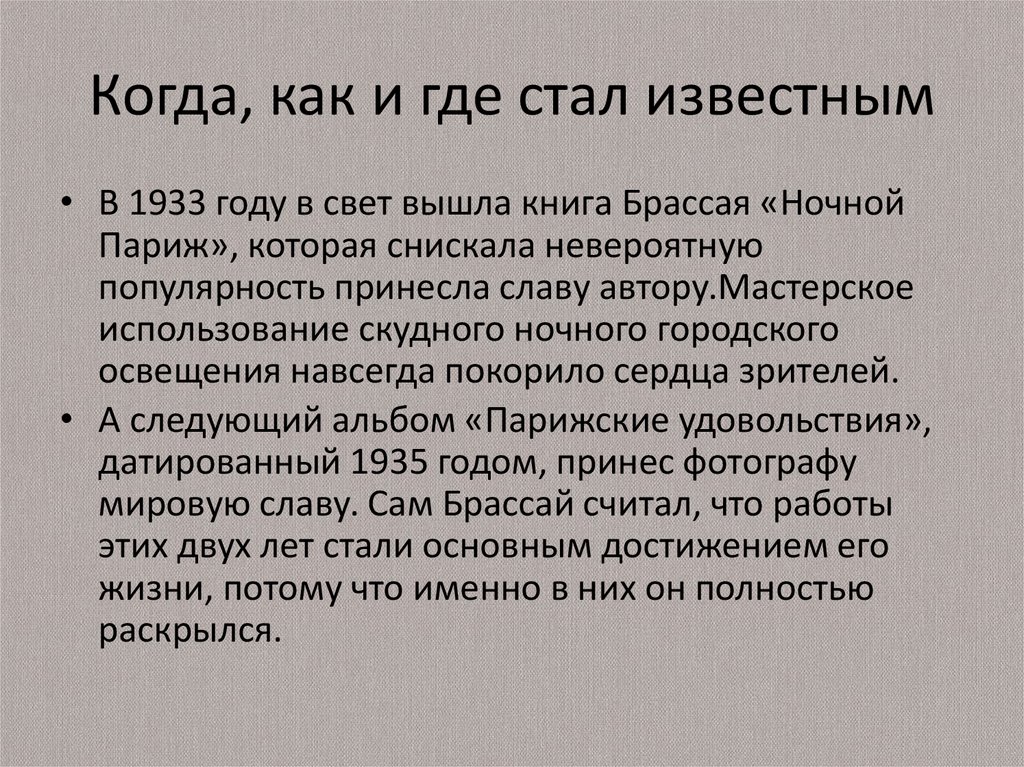 Когда, как и где стал известным• В 1933 году в свет вышла книга Брассая «Ночной