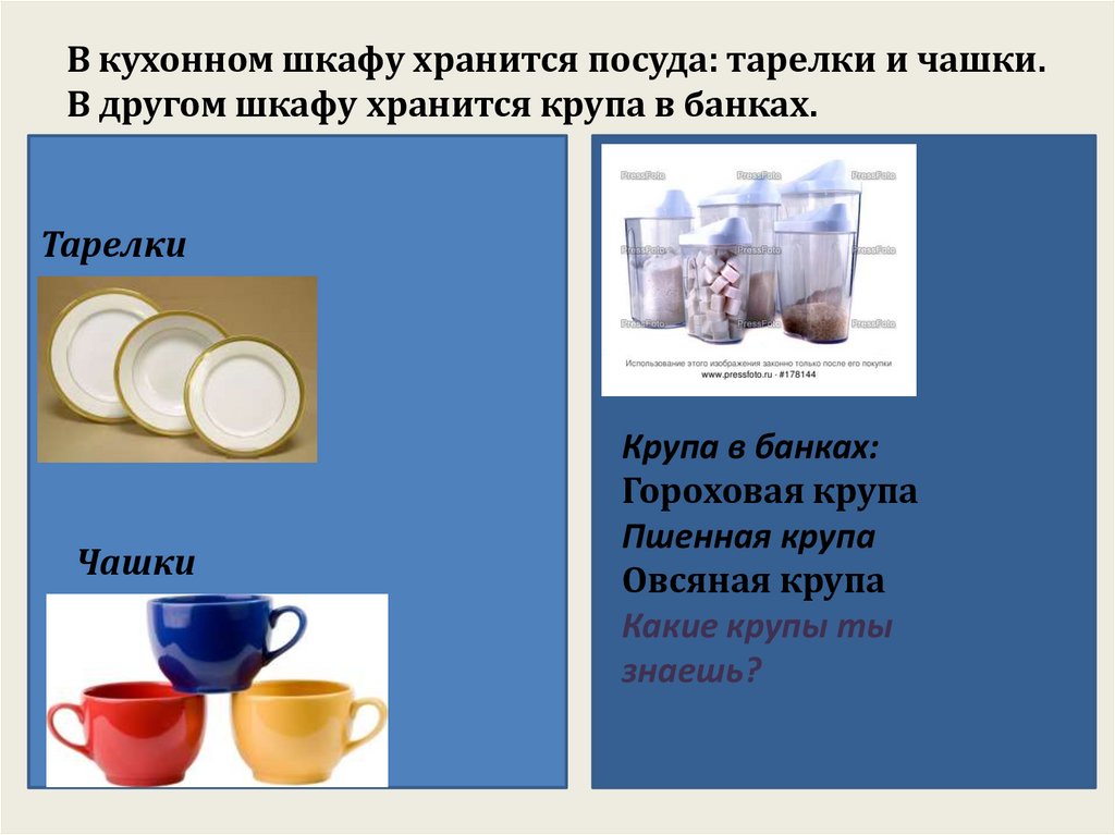 В кухонном шкафу хранится посуда: тарелки и чашки.В другом шкафу хранится крупа в банках.