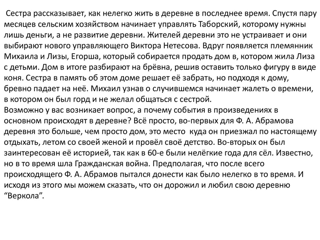 Если вспомнить несколько произведений Ф. А. Абрамова, например:“Братья и Сёстры”, “Дом” и другие. Можно заметить, что все они