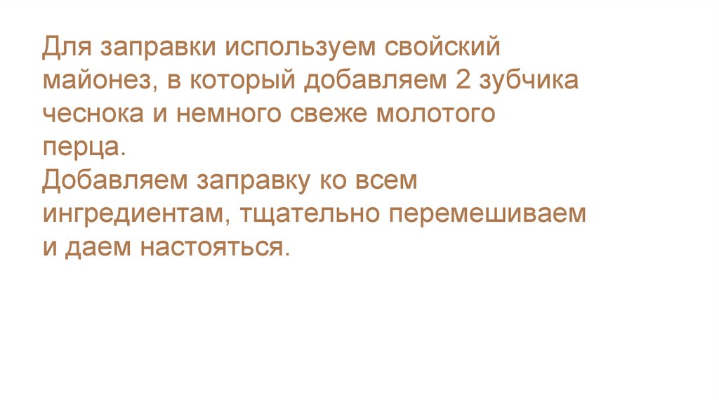 Для заправки используем свойскиймайонез, в который добавляем 2 зубчика