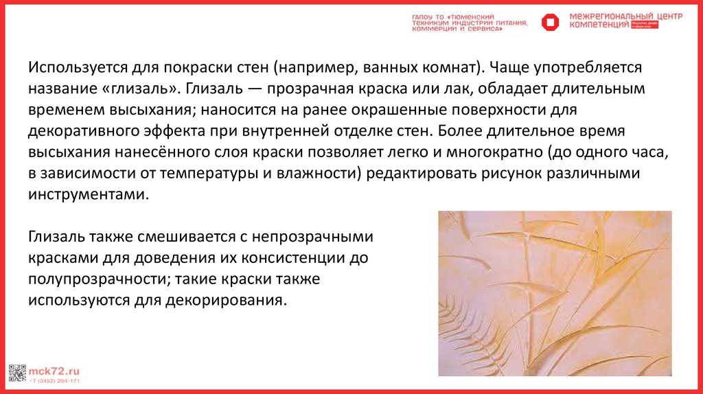 Используется для покраски стен (например, ванных комнат). Чаще употребляетсяназвание «глизаль». Глизаль — прозрачная краска или лак, обладает длительным