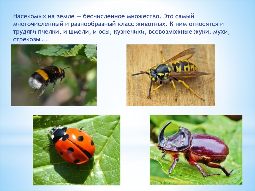 Насекомых на земле — бесчисленное множество. Это самыймногочисленный и разнообразный класс животных. К ним относятся и