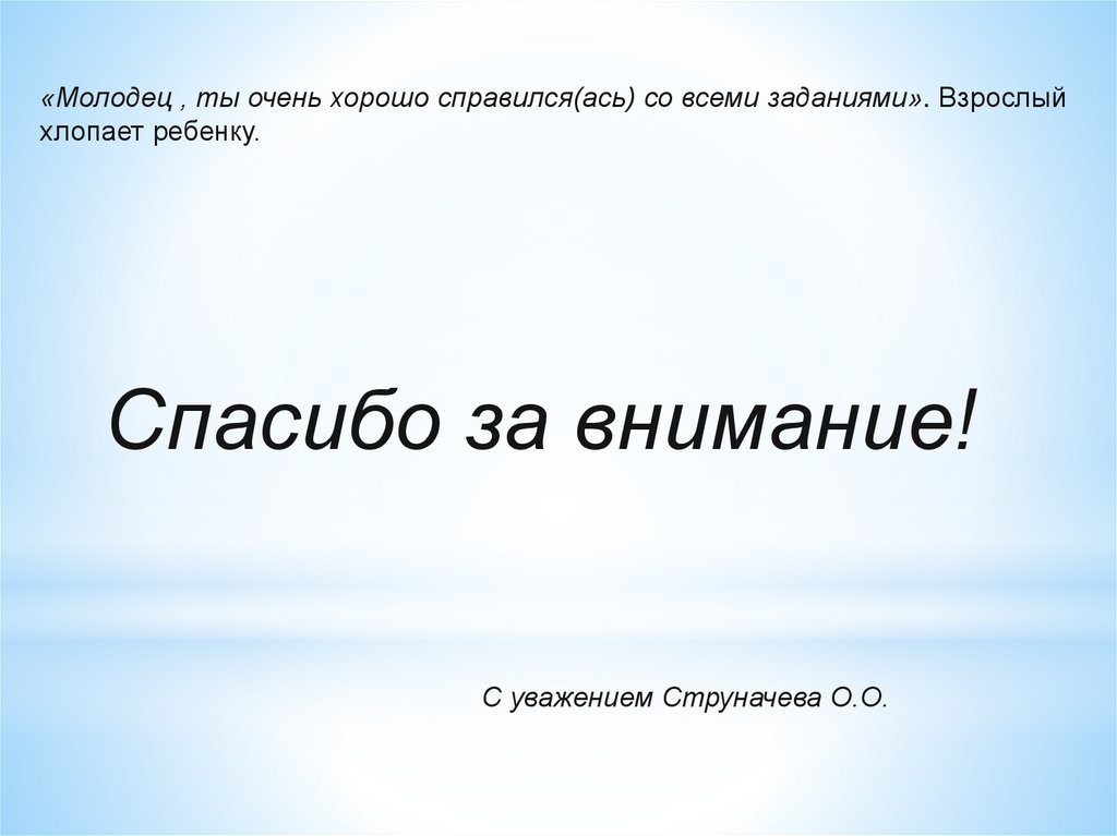 «Молодец , ты очень хорошо справился(ась) со всеми заданиями». Взрослыйхлопает ребенку.