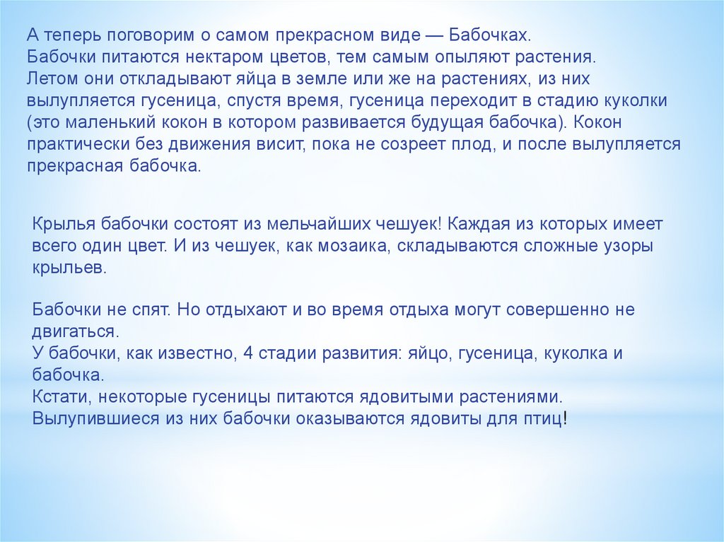 А теперь поговорим о самом прекрасном виде — Бабочках.Бабочки питаются нектаром цветов, тем самым опыляют растения.
