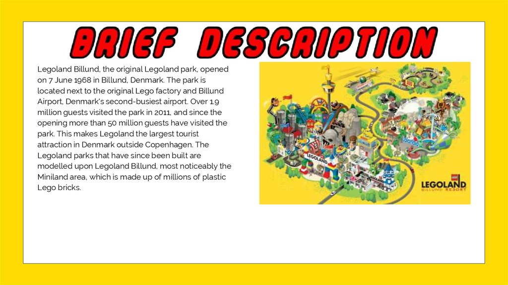 Legoland Billund, the original Legoland park, openedon 7 June 1968 in Billund, Denmark. The park is