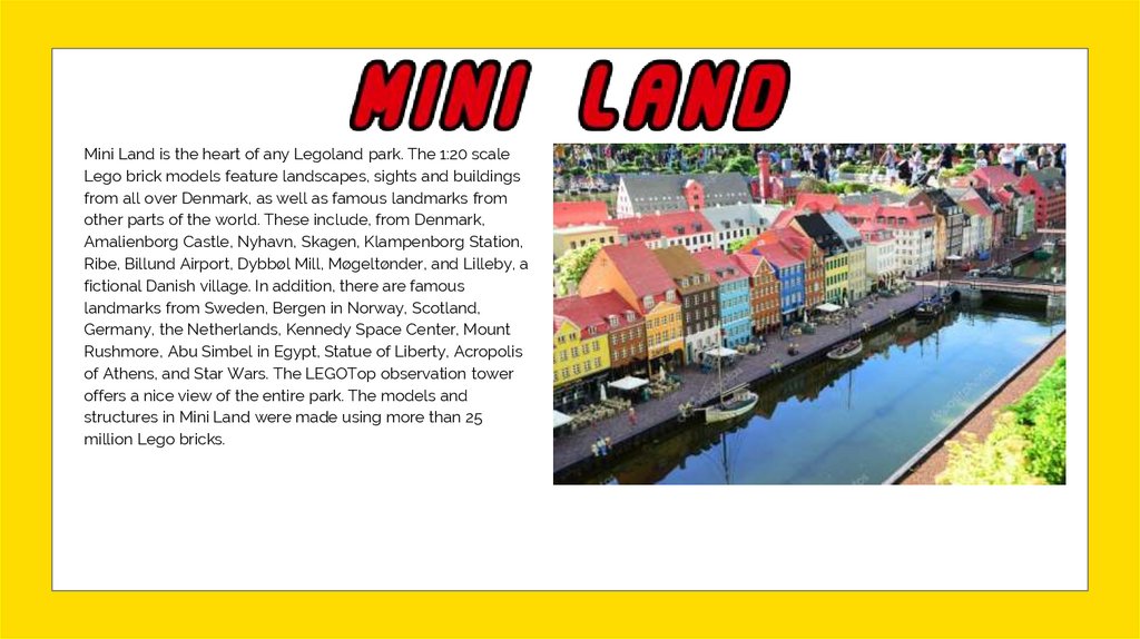Mini Land is the heart of any Legoland park. The 1:20 scaleLego brick models feature landscapes, sights and buildings