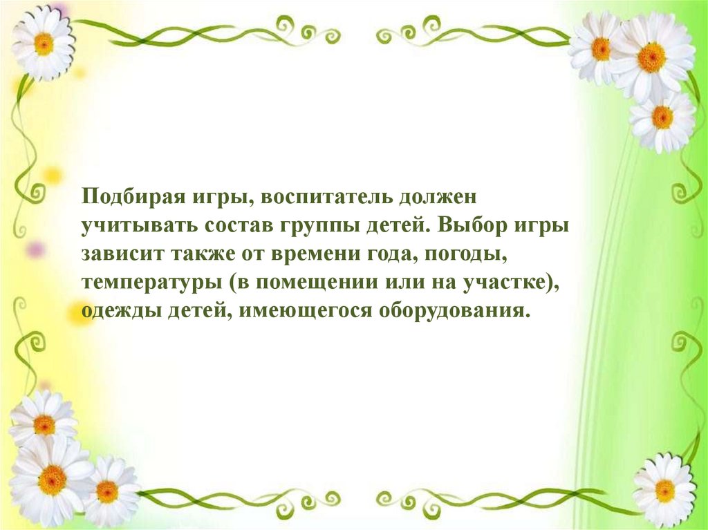 Подбирая игры, воспитатель долженучитывать состав группы детей. Выбор игры